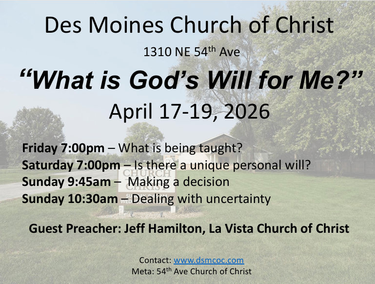 Welcome to the Des Moines church of Christ website. Our efforts are focused on serving God and worshiping him in spirit and in truth. If you have bible questions we would like to help you find the answers contained in God’s word. We invite you to stop in and study God’s word any time you have the opportunity.
